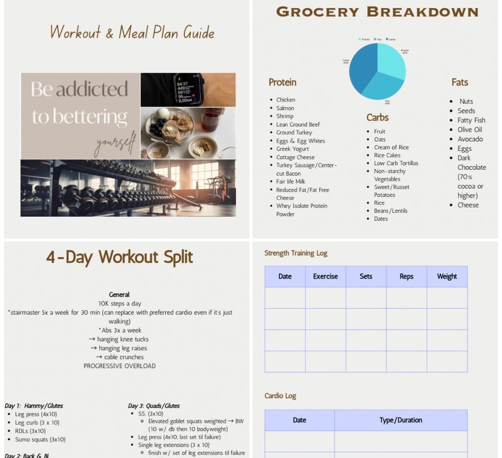 ✔️ Easy-to-follow 3, 4, and 5 day workout splits ✔️ Step-by-step lifting guidance + form/technique tips ✔️ How to calculate your personal macros + calorie goals ✔️ High-protein meal ideas for breakfast, lunch & dinner ✔️ Snack and sweet treat ideas that support your goals ✔️ Smoothie and shake recipes you’ll actually crave ✔️ Grocery list & go-to staples to simplify shopping ✔️ How to stay consistent without being perfect ✔️ Progress tracking pages to keep you motivated